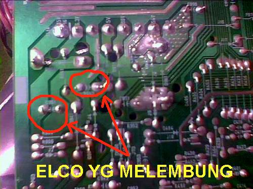 2. Cek elco regulator 1000uF/10v untuk tegangan 15 dan 5 volt. Biasanya elco ini melembung sehingga menyebabkan tegangan keluaran menjadi tidak normal. Padahal tegangan ini dibutuhkan oleh ic program yg paling besar yg kakinya banyak untuk bekerja. Dan di IC inilah semua pengaturan monitor berlangsung termasuk tombol on/ off nya.